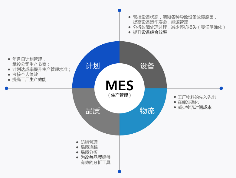 管理生产活动的所有行为,包含 生产计划,生产实绩,生产工艺,品质管理,品质追踪,设备管理,仓储管理,能源管理等;