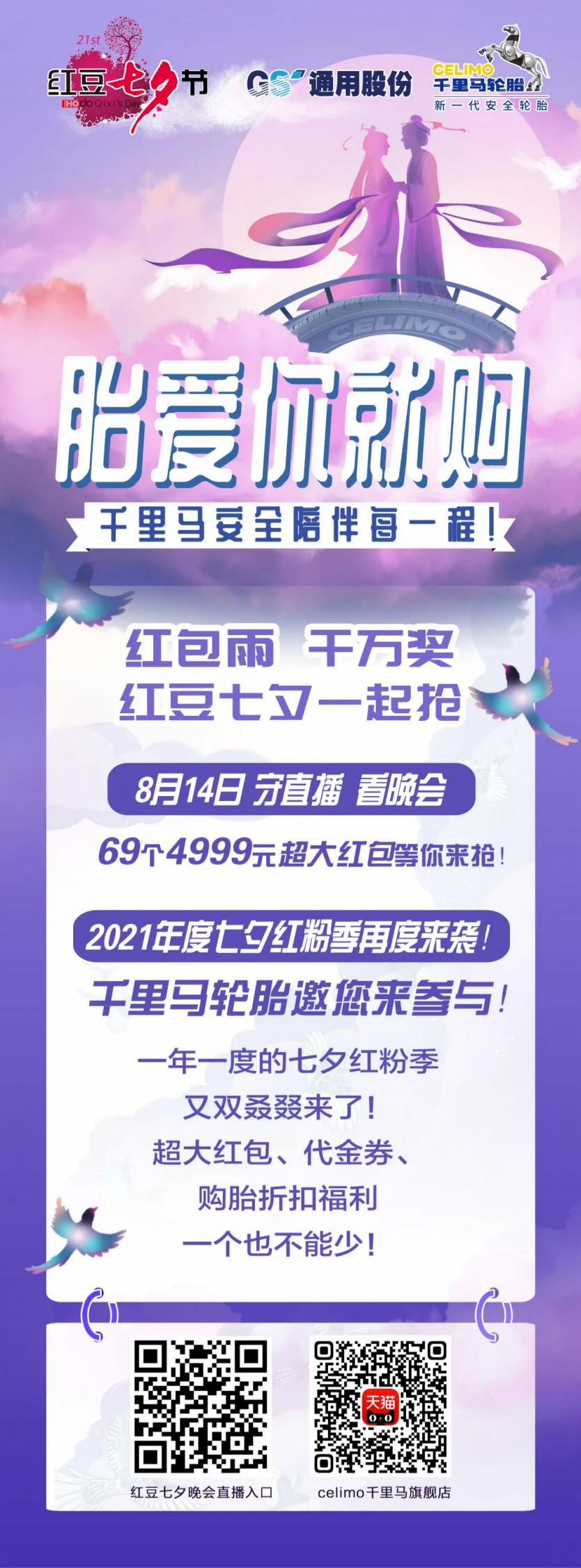 红包产生路径:“celimo千里马”天猫官方旗舰店将抽取一名幸运消费者,另外还将有68个4999元红包名额将通过红豆七夕晚会(2021年8月14日20点至22点)在直播平台现场瓜分。