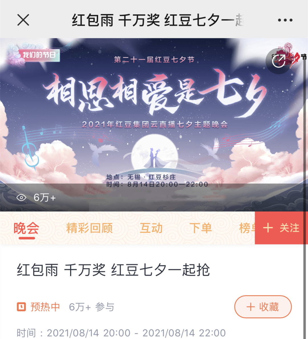除了央视的七夕晚会,红豆集团还会给大家奉献一场特别的红豆七夕节晚会。与大家在七夕节当晚共享视觉与福利盛宴。去年的红豆七夕节20周年直播主题晚会更是创造了1.2亿直播观看量!