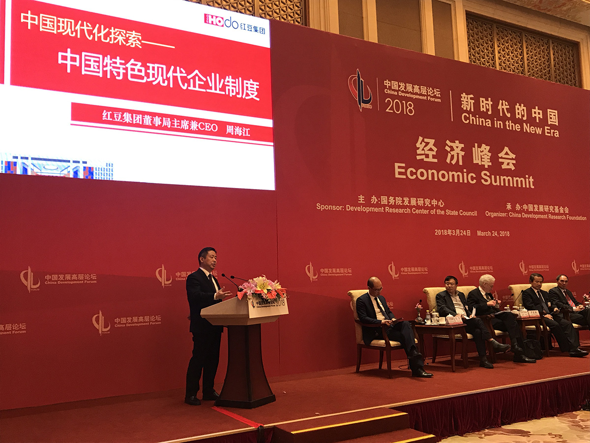 “中国共产党与中国现代化”分组会是本次论坛的亮点之一,由人民网总裁叶蓁蓁主持,中央党史和文献研究院院务委员陈晋、剑桥大学教授彼得•诺兰、新加坡国立大学教授郑永年、红豆集团董事局主席兼CEO周海江等领导专家作了交流发言。周海江结合红豆集团多年来探索实践的《中国特色现代企业制度》,与中外嘉宾分享了企业党建与中国现代化的关系。