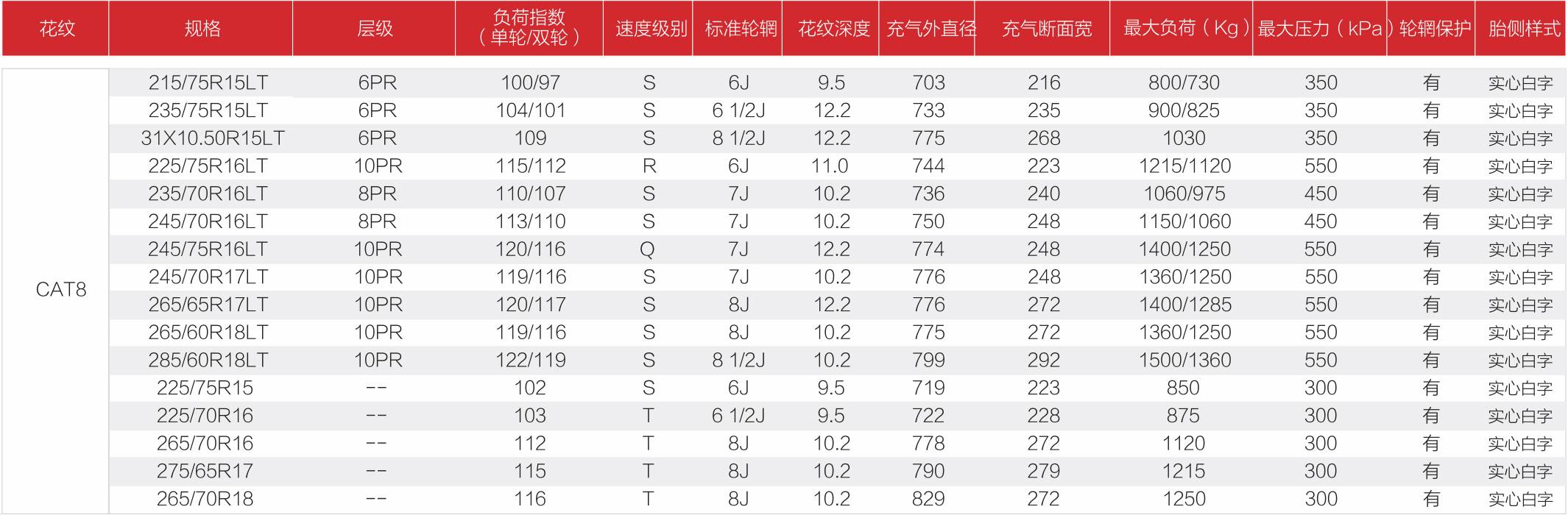 GUANYU A/T CAT8拥有曲折花纹沟设计,适应各种恶劣路况。连贯的横向倾斜沟槽在湿地路面有效排除积水,提供持续稳定的抓地能力。全新耐磨配方,适合比较苛刻的路面,保证了轮胎寿命。